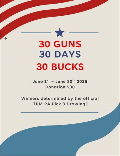 We are happy to present our 2026 30-30-30 Raffle Tickets! Tickets are a $30 donation, prizes will be selected each day of June 2026. Winners will be determined by the official 7PM PA Pick 3 Drawing (See Prize List Below)
